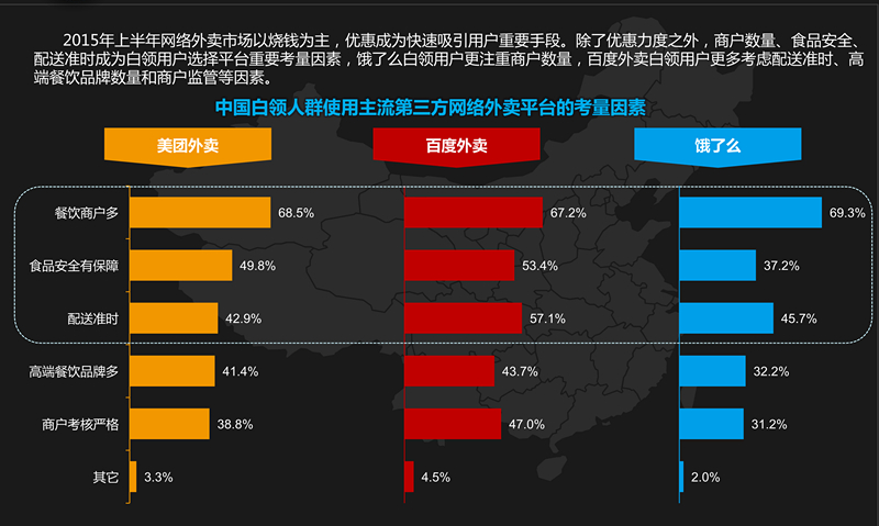 這其實(shí)說明了,白領(lǐng)的需求并非僅僅只是需要外賣、解決時間問題,在解決時間問題之外,白領(lǐng)用戶對于餐飲的質(zhì)量,諸如包裝安全、物流速度、冷熱保溫,都有著更高的要求。想比之下正如打車O2O一樣,早期的打車O2O用戶只需要用手機(jī)打到車就心滿意足,但是隨著市場的發(fā)展,用戶更多想要優(yōu)質(zhì)的乘車體驗(yàn)被發(fā)掘了出來,專車相對于出租車,車主的素質(zhì)更高,更有安全性,因此對出行服務(wù)有更高追求的用戶選擇了專車出行。而外賣也是如此,在早期“吃什么”解決之后,白領(lǐng)用戶也向“吃的好”的需求衍生。