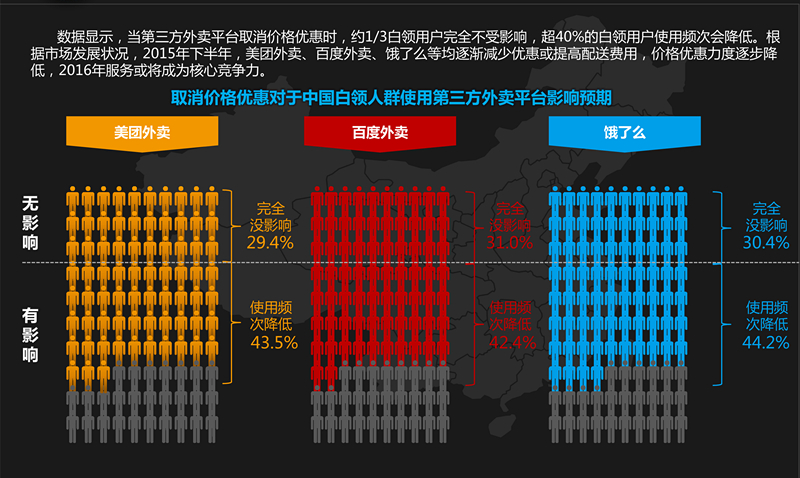 白領(lǐng)人群的消費(fèi)具有較高黏性,一旦選定某個外賣平臺,忠誠度也會更高。DCCI針對這一問題進(jìn)行了專門的數(shù)據(jù)調(diào)研。結(jié)果顯示,取消價格優(yōu)惠后,表示“完全不受影響”,仍然會繼續(xù)使用百度外賣的白領(lǐng)用戶最多。餓了么所受影響最大,在取消價格優(yōu)惠后,有近一半的餓了么白領(lǐng)用戶會降低使用頻次。