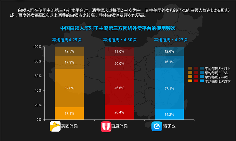 白領(lǐng)群體的消費(fèi)次數(shù)每周以2-4次為主,從平均來看美團(tuán)外賣為4.29次,百度外賣為4.30次,餓了么為4.27次,彼此不分伯仲,但是從整體上來看,百度外賣的白領(lǐng)人群整體頻次更高。