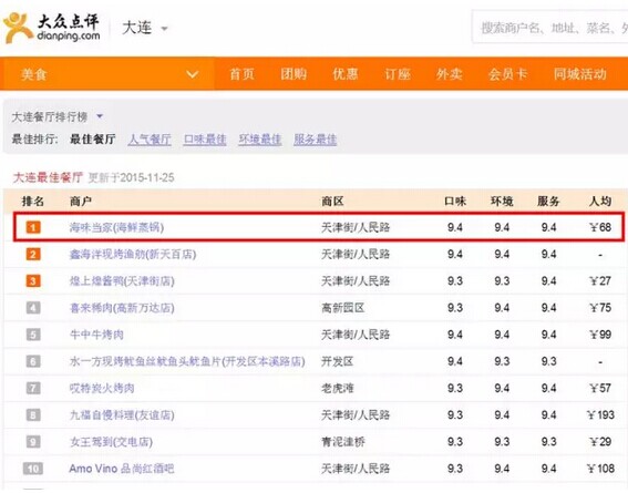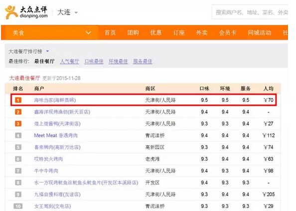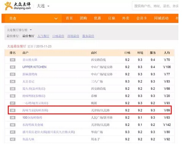 重新開業(yè)第7天進(jìn)入大眾點(diǎn)評(píng)大連最佳餐廳排行榜,位列38名