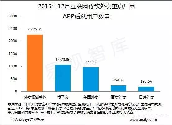用戶活躍度方面,2015年12月的外賣市場整體APP活躍用戶數(shù)量為2275.35萬戶,其中,餓了么活躍用戶達1070.06萬戶,占比接近一半,美團外賣活躍用戶達973.350萬戶,二者組成第一集團。由百度外賣和口碑外賣組成的第二集團則分別只有200多萬的的活躍用戶,差距較大。