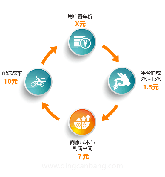 以客單價(jià)30元為例,商家成本與利潤(rùn)空間=客單價(jià)30元(用戶消費(fèi))-平臺(tái)抽成1.5元(3-15%平臺(tái)引流、運(yùn)營(yíng)投入)-配送10元(平均每單8-12元)= 19.5元。