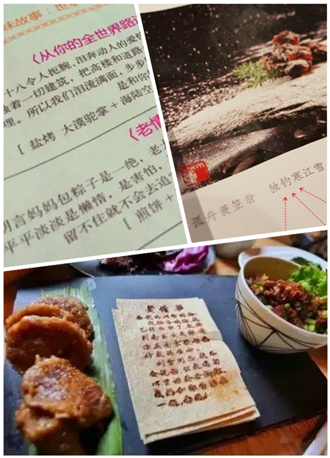 此外,那些熱門小說家開的“小說餐廳”,像張嘉佳的“從你的全世界路過”、韓寒的“很高興遇見你”等等,菜單上的菜品名都是與小說情節(jié)有關(guān)的詞句,但從詞句上很難看出這道菜的“真面目”。這樣會講故事的菜單,讓人們在閱讀菜單時有了濃重的代入感和好奇心,也因此對菜品更加印象深刻。